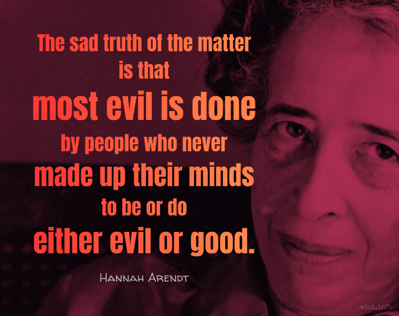 Originally printed as an essay (1977-11-28), "Thinking -- III," The New Yorker (1977-12-05). That version is slightly longer:The sad truth of the matter is that most evil is done by people who never made up their minds to be either good or bad or to do either good or evil.